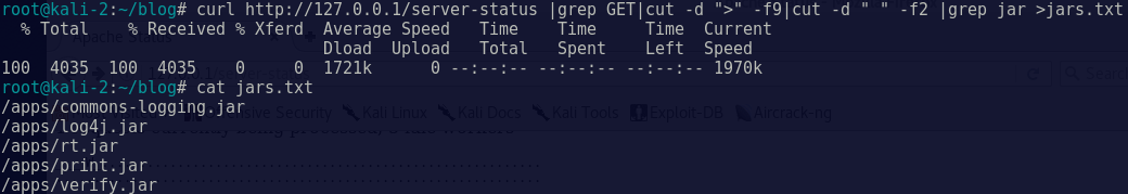 curl http://<site>/server-status | grep GET | cut -d “>” -f9 |cut -d “ “ -f2 |grep jar > jars.txt
