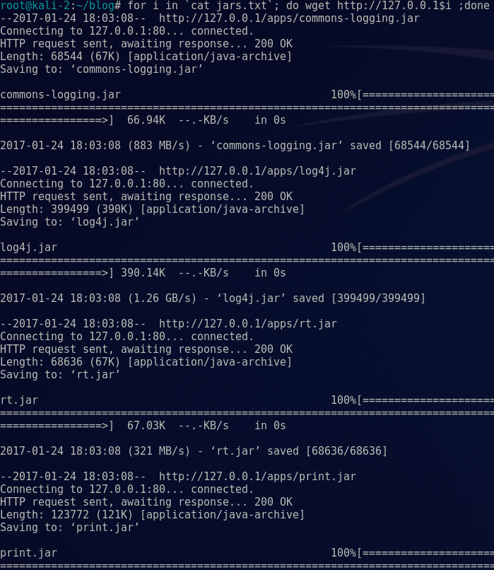 for I in `cat jars.txt` ; do wget http://127.0.0.1$i ; done