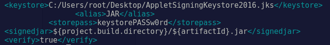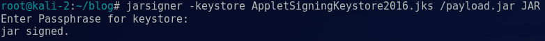 jarsigner -keystore AppletSigningKeystore2016.jks /payload.jar JAR