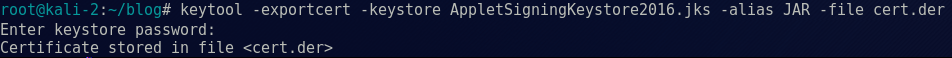 keytool -exportcert -keystore AppletSigningKeystore2016.jks -alias JAR -file cert.der