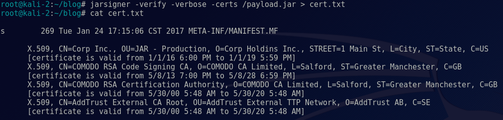 Using the Jarsigner application provided in Java’s JDK, we were then able to sign the payload with the AppletSigningKeystore2016.jks Keystore, containing the client’s code signing certificate: