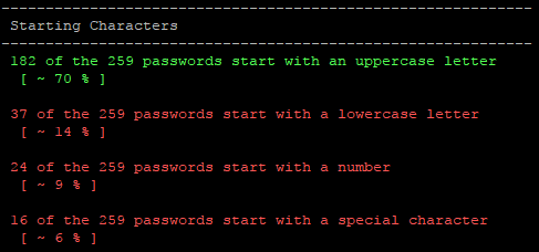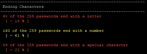 Next, we see is that 61% of the passwords end in a number. This was a surprise to me. I thought that a special character would be the most common, but I was way off the mark on that assumption. It seems reasonable though, given the amount of "Password1" passwords we see. Now we see why the append_d rule was so effective.