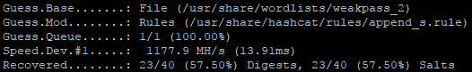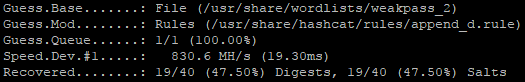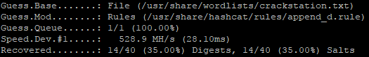 - Run it by itself, then run through the append_d, append_s, and leetspeak rules