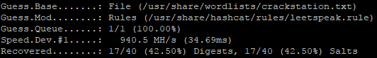 The leetspeak rule is moderately effective, only adding about 2.5% more cracks to each wordlist it was paired with. However, those passwords have often been admins or service accounts in our recent experiences, so it's worth an extra run through the gauntlet.