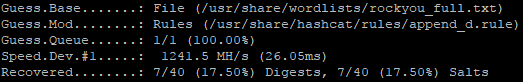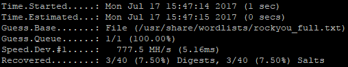 The RockYou wordlist is from the Rockyou.com breach. It was the largest dump of plaintext passwords at the time, and has been a quick go-to for several years now. It comes default with Kali Linux and, compared to the others above, it's tiny weighing in at only 139MB. It takes only (1) second to run through it. It takes longer to type out the actual command to run it… The initial crack rate is unimpressive, at 7.5% in our test case, but it runs so fast that it's worth a check.