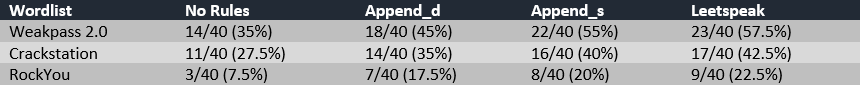 After a couple days' worth of running wordlists/rules combinations and a ton of waiting, we found the most effective wordlists for our test case: