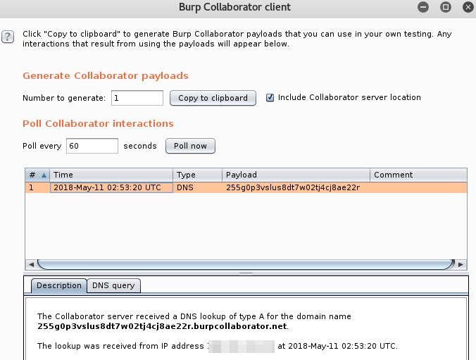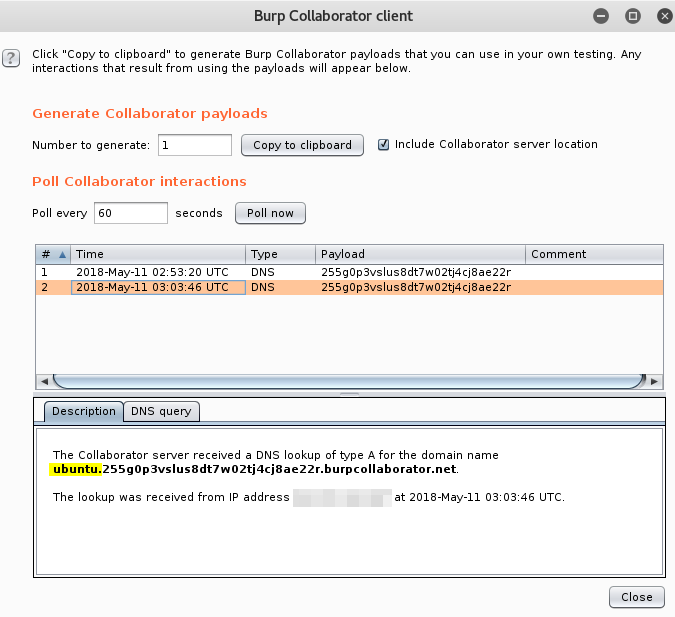 But we see the response to our injection received by the Collaborator client, confirming we have command execution.