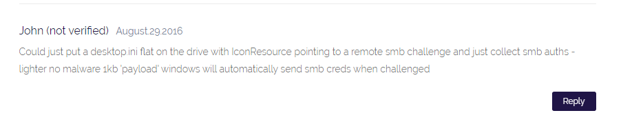 As John reveals, making a callback is as simple as including a desktop.ini file with a link to our collection server. Not only that, but Windows will negotiate NTLM authentiction with this URL, allowing us to collect the hash of the user connecting the drive.